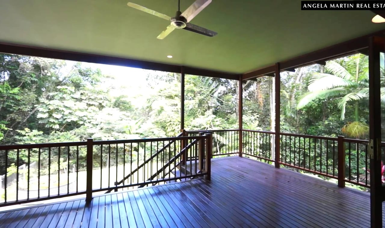 The house has open plan living with 12 foot ceilings, 2 lifestyle decks and a fireplace for those cooler rainforest nights. The kitchen comes with smeg stainless steel appliances and has lovely wooden bench tops. The 3 bdrms all have built ins plus there’s an additional good size study. The bathroom and separate toilet have calming views to the garden.